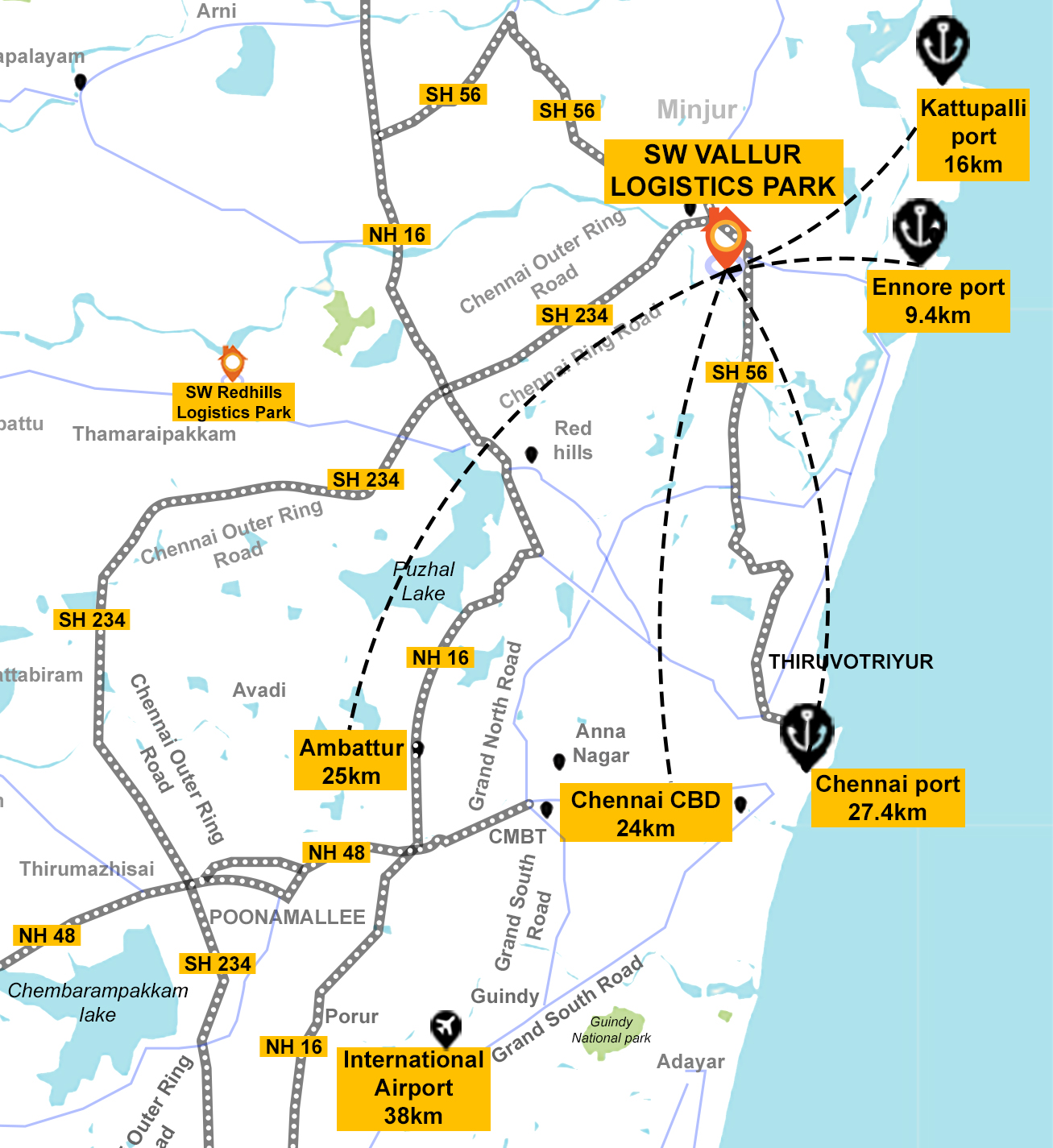The site lies on Manali–Ponneri Road (SH 56), just 1.5 km from the Outer Ring Road (ORR). It is in close proximity to all three Chennai ports, with Ennore Port only 7 km away. Its location near the CBD and ORR provides excellent connectivity to Sriperumbudur, Oragadam, GST Road, and the southern Chennai markets.